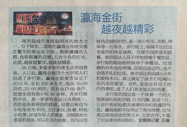 步行街的周邊是一個挨著一個的大型商場和臨街店鋪,燈光閃耀,連成一片,讓步行街到處都充滿著時尚和浪漫的氣息。 灜海金街不僅帶動了夜間消費,也與周邊商場形成優(yōu)勢互補、互助合作,豐富了民眾夜間休閑娛樂。全媒體記者 王琳